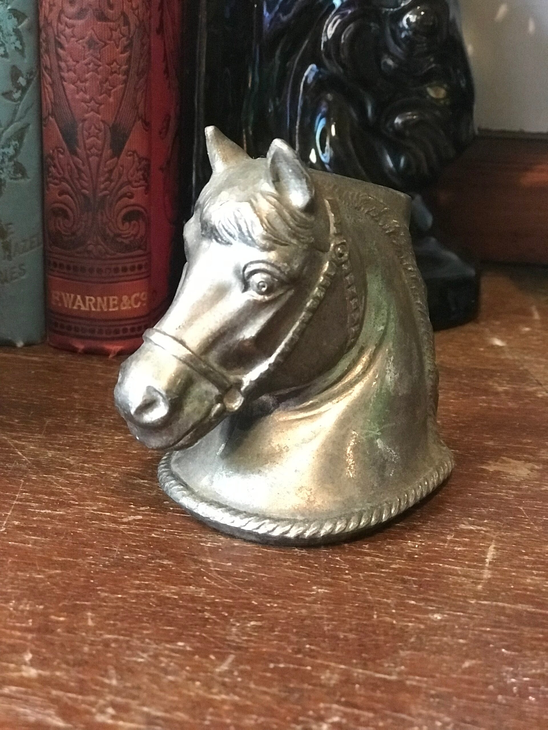 A very detailed beautiful horse head, perfect for holding pens, cocktails sticks or matches. In a former life it would of been a table top lighter! Approx size 3" x 3"