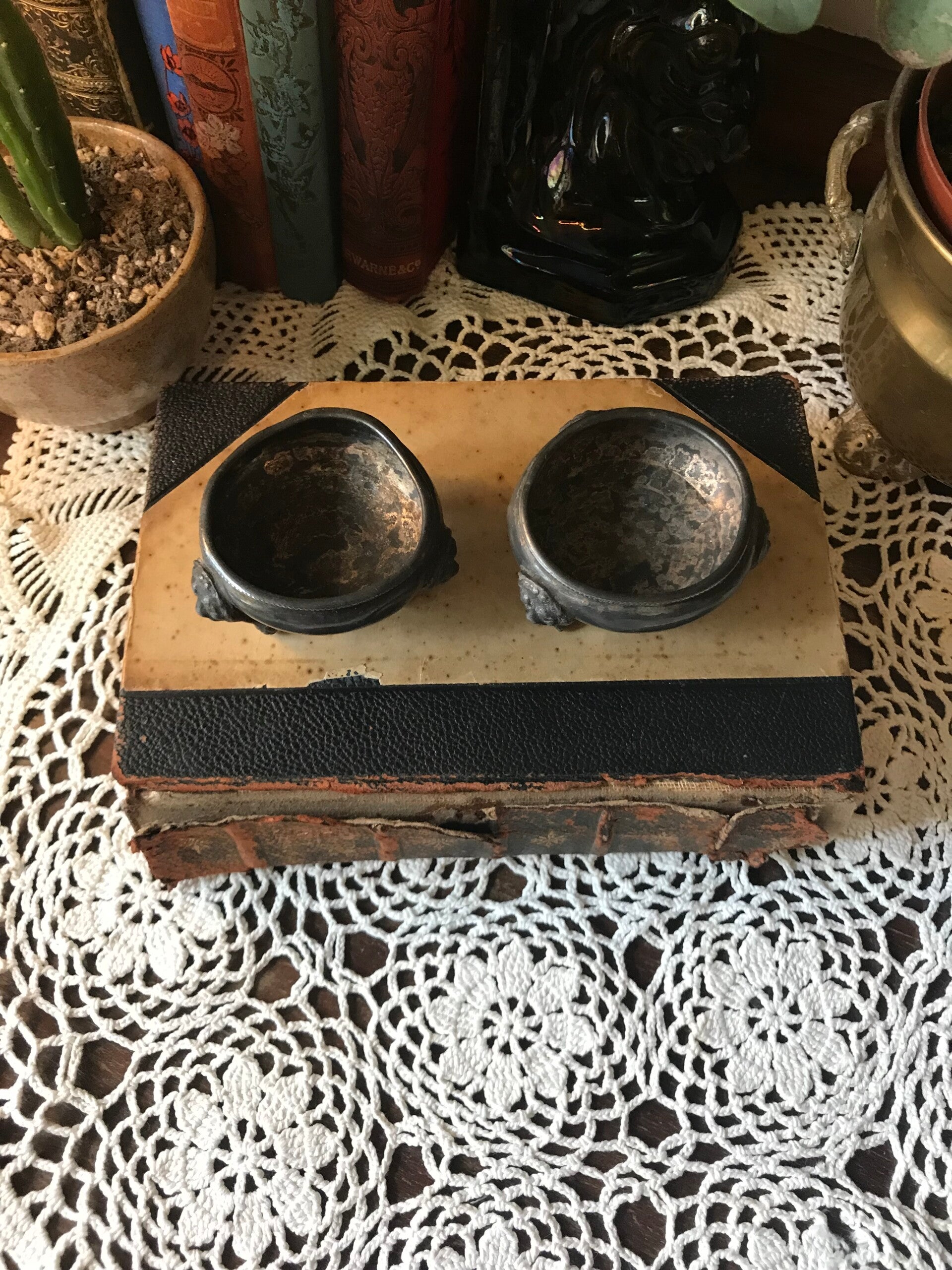 A lovely little pair of wonky antique pewter salt cauldrons, they are rather wonky but this adds to their charm! Approx size 1.5" x 2"