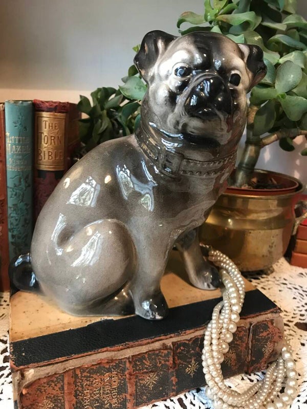 A rather regal Staffordshire style pug fireside dog, in excellent condition for age, approx size 7”h x 7”w x 4”d