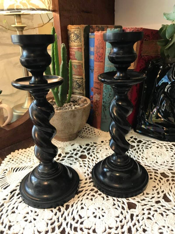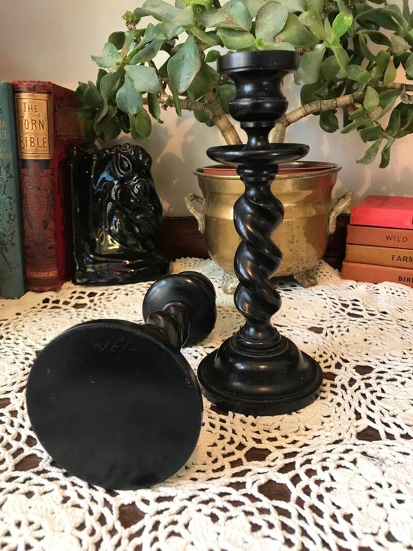 Beautiful vintage ebony candlesticks. Approx size 7" good used condition, some cracking around top due to use.