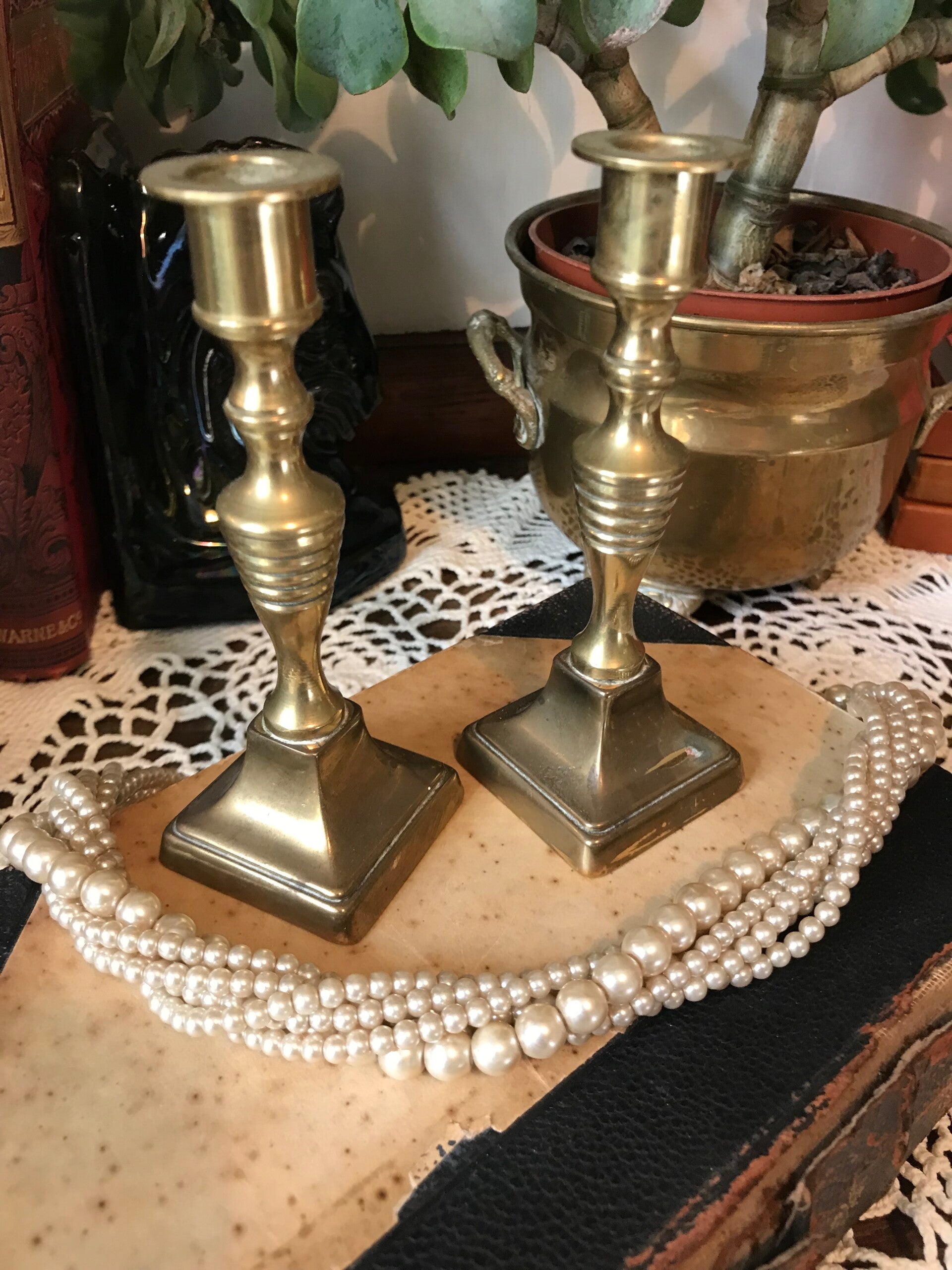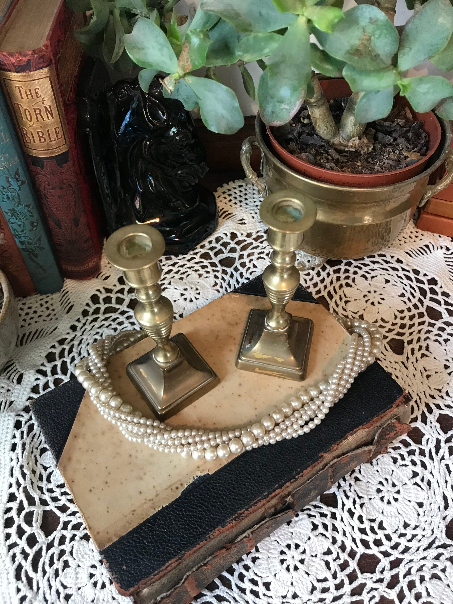 Beautiful antique pair of decorative brass candlesticks, approx size 5" in great condition.