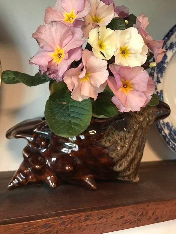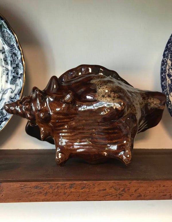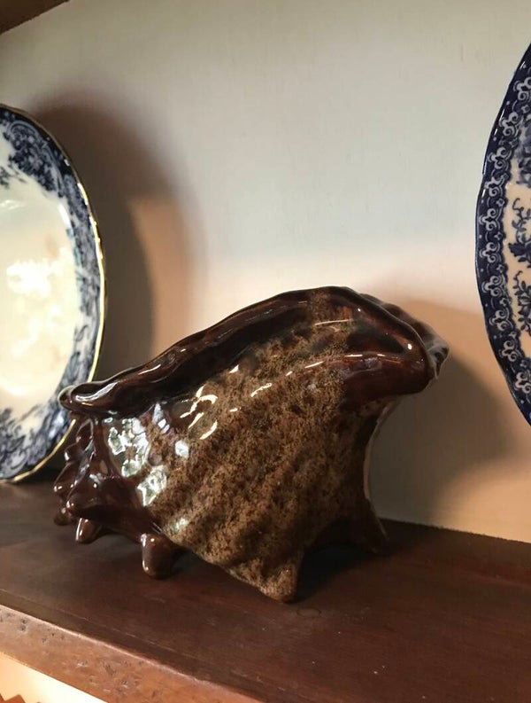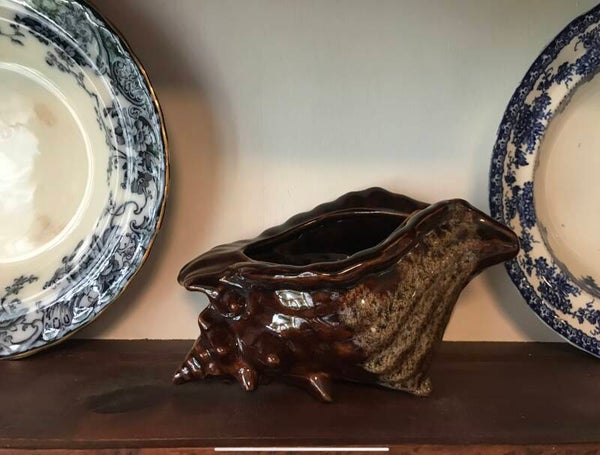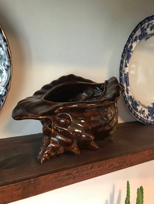 A beautiful shell planter in the shape of a conch shell. With a lovely brown mottled glaze, approx size 4”x8”x6” in excellent condition