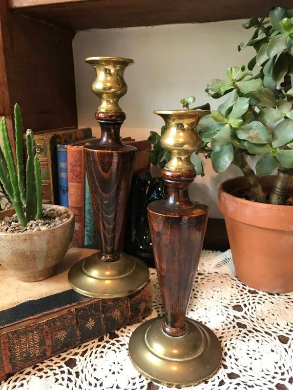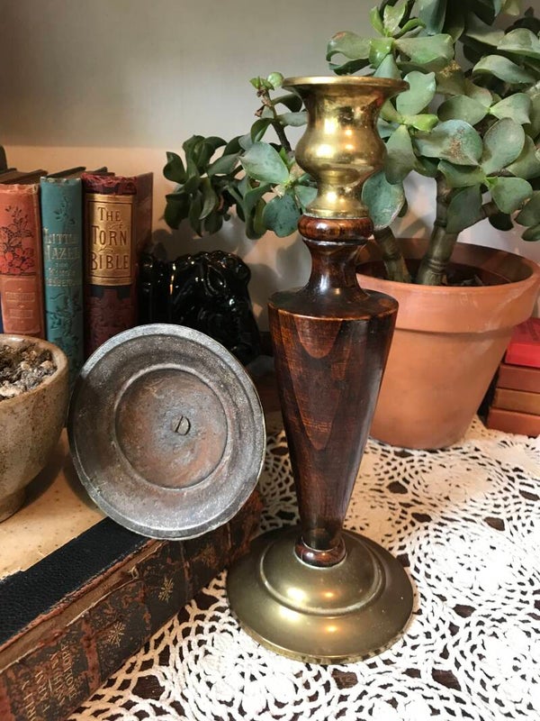 Very beautiful pair of antique brass and hardwood candlesticks, approx size 9.5" very heavy and in great condition