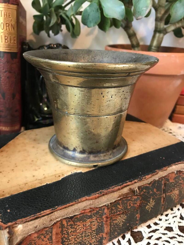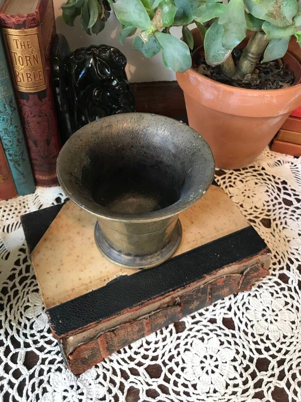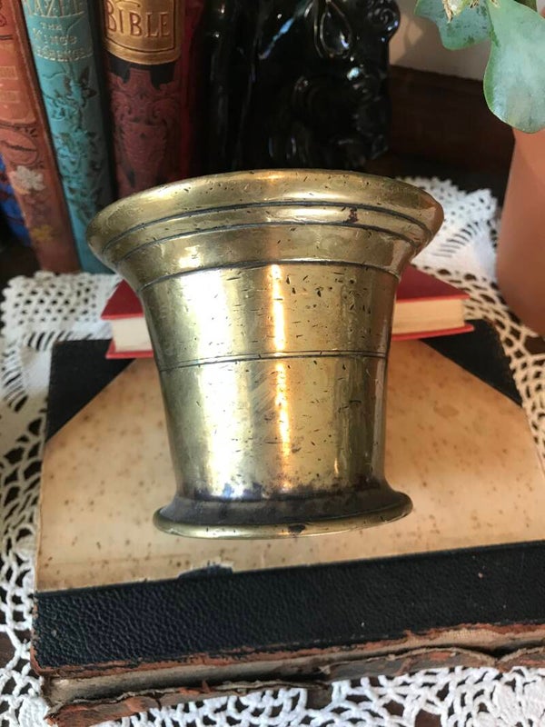 A very heavy antique apothecary solid brass mortar, excellent condition for its age, approx size 3.5"hx4.5"w