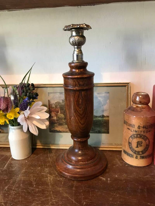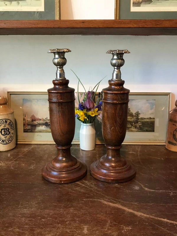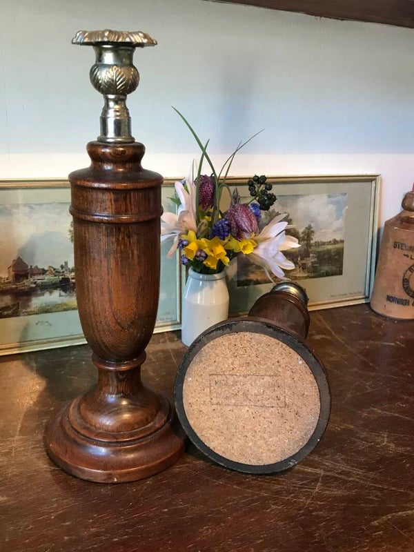 Pretty pair of vintage hardwood candlesticks with silver metal sconces, approx size 12"x4.5" in good condition.