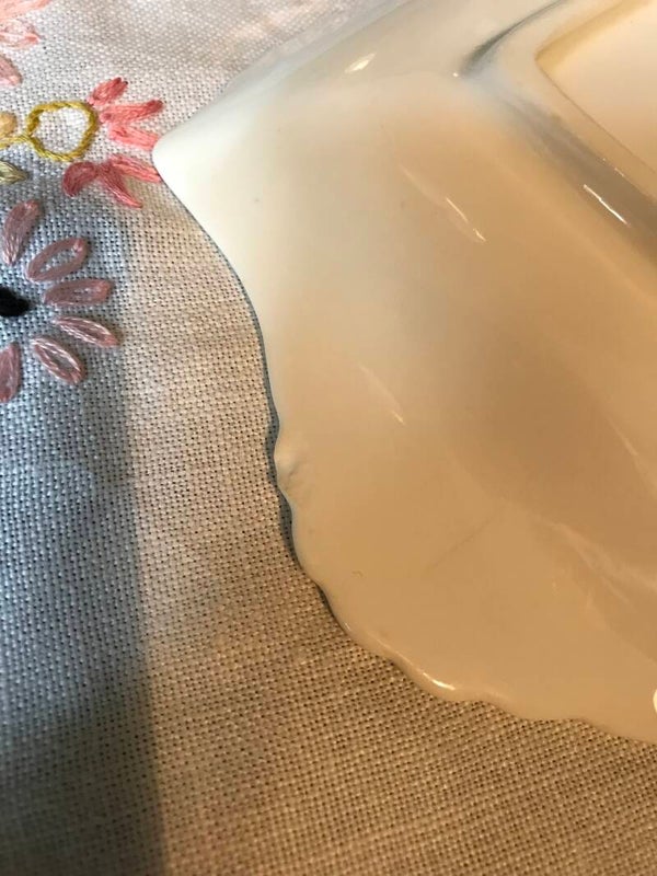 Beautiful bone China white serving plate, good condition with one small chip underneath one of the handles. Approx size 13”x5”