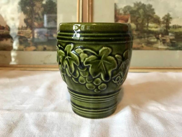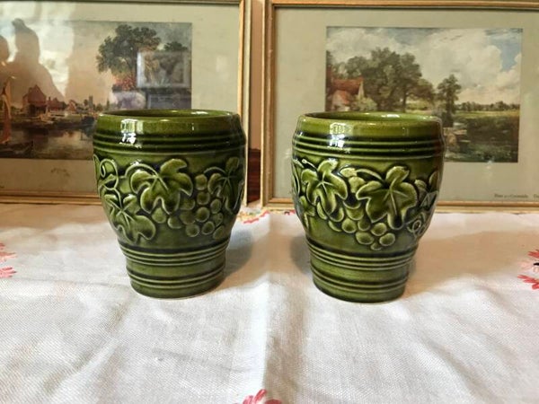 A beautiful pair of vintage cups with leaf and vine detailing. In a beautiful dark green colour perfect for any decor. Both in very good condition, approx size 3.5”x2.5”