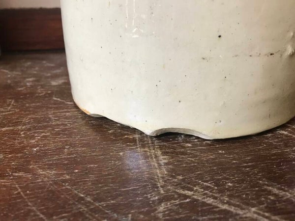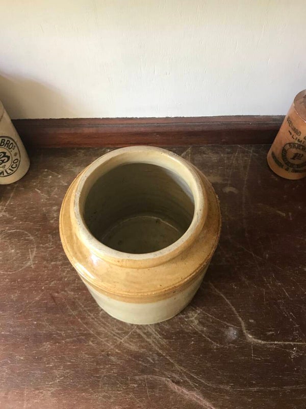 A beautiful lighter colour two tone stoneware crock, perfect for kitchen utensils or flower arrangements. Has some large chips on the bottom, please study photos for a detailed description. Stamped with Doulton Lambeth, Approx size 7.5"x6"