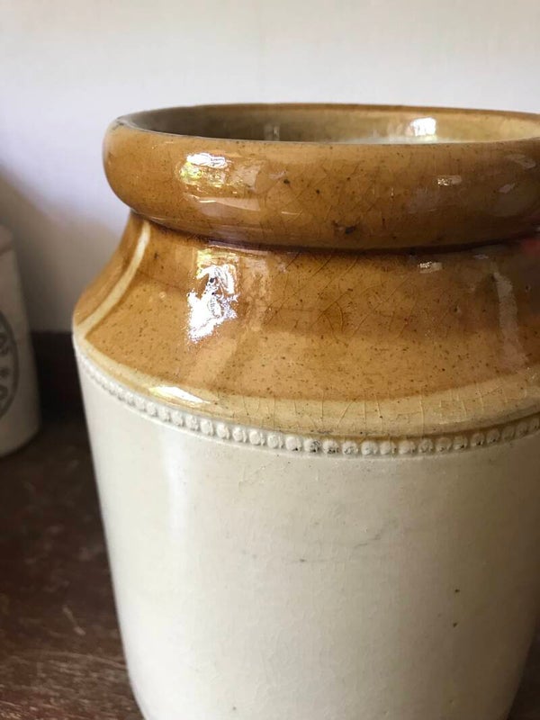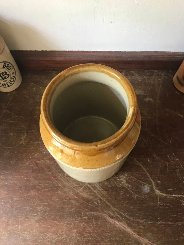 A beautiful two tone stoneware crock in very good condition for age, perfect for kitchen utensils or flower arrangements. Approx size 7.5"x6"