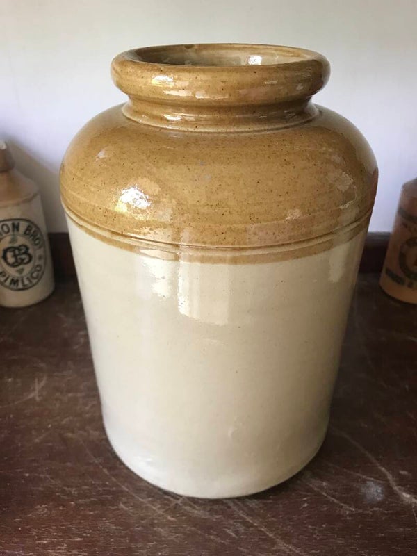 A beautiful XL two tone stoneware crock in excellent condition for age, perfect for kitchen utensils or flower arrangements. Approx size 10.5”x7"